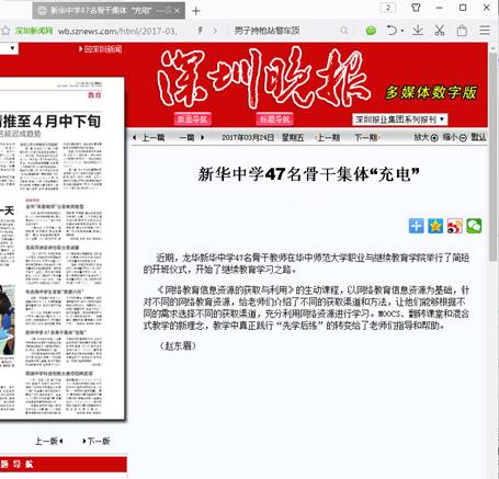 深圳晚报324日以 “新华中学47名骨干集体充电”为题,专项报道我校教师培训工作动态,简要介绍了我校职业与继续教育学院开展的深圳市新华中学骨干教师培训工作,并对该项培训做了充分的肯定。