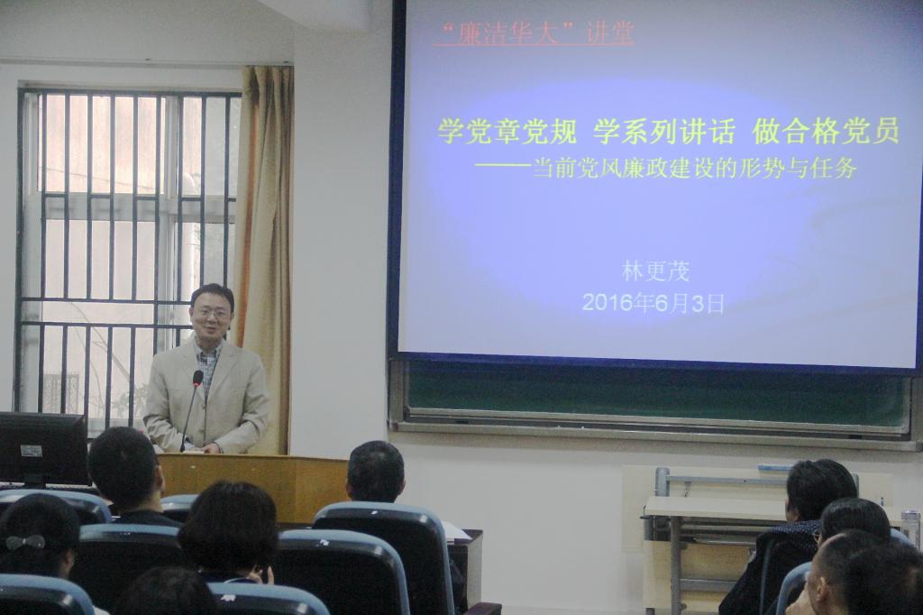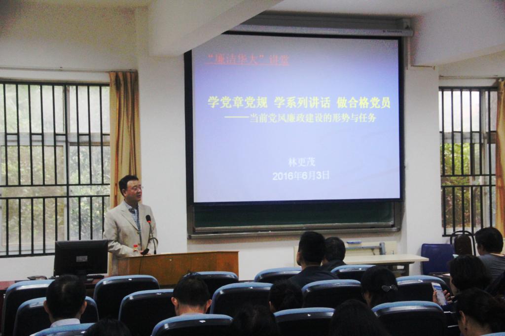 根据学校《关于开展2016年“党风廉政建设宣传教育月”活动的通知》精神,6月3日下午,校长助理、校纪委副书记、监察处处长林更茂受邀在职教院南湖教学楼104报告厅给职业与继续教育学院教职工做了《学党章党规 学系列讲话 做合格党员》专题报告。这是今年“廉洁华大”讲堂的第一讲。