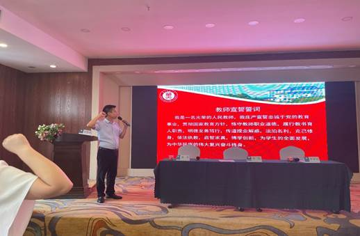 最后,全体学员在胡毅老师的带领下光荣宣誓:“我是一名光荣的人民教师,我庄严宣誓………为学生的全面发展,为中华民族的伟大复兴奋斗终生。”一句句铿锵恢宏的誓词,体现了每一位老师对教育事业的无限热爱与忠诚。
