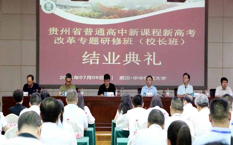 (通讯员:余颖秋)7月9日上午,贵州省2021年普通高中新课程新高考专题培训班(第二期校长班)结业典礼在我校管理教育综合楼103报告厅举行。来自贵州全省9个地、市、州的171名高中校长圆满完成了为期6天的各项培训任务。贵州省教育厅副厅长周进、华中师范大学副校长夏立新、校长助理林更茂、贵州省教育厅基础教育处主持工作副长处叶学仕、我校培训中心副主任朱虹等出席典礼。典礼由培训中心主任卢子洲主持。参会嘉宾共同为学员代表颁发了优秀学员证书和培训结业证书。