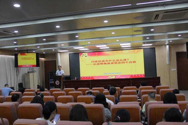 林更茂以《印度抗疫为什么这么渣?——从疫情角度谈坚定四个自信》为题从国家治理、物质基础、文化底蕴、四个自信等四个方面对比分析介绍了印度和中国抗疫的不同表现及内在原因,回答了“印度抗疫为什么这么渣?中国的表现为什么与众不同?”的疑问,并从中得出结论:在经历了抗击新冠肺炎疫情的“大考”之后,我们要更加坚定道路自信、理论自信、制度自信、文化自信。
