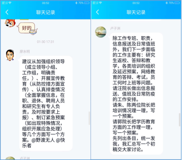 1.对在职人员服务,重在上传下达。自1月26日至3月4日,学校新冠肺炎疫情防控指挥部共发布了22次通告,每一次通告都是学校对二级单位的具体工作部署。任务上传下达、工作落实落地的压力落到了第一党支部党员身上。宋卫东同志作为综合协调组组长,始终扮演着“联络员”的角色。他牵头建立了中心(学院)疫情防控工作群;确定在职教职工“封城”后的去向;主动承担了春节期间中心(学院)所有的值班任务;积极与物业联系,对办公楼进行全面消毒。黄俊伟同志密切关注学校动态,及时做好各项工作的上传下达,将疫情相关信息在中心(学院)QQ工作群发布,同时耐心解答教职工疑惑。