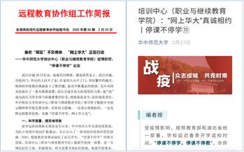 支部党员还积极参与并投身于中心的对外宣传,周自波同志在完成各项工作之余,按照中心“新冠肺炎疫情防控领导小组”的宣传要求,撰写培训中心疫情防控宣传稿件,把疫情中的华中师大以及培训中心展示给社会,树立了良好的华中师大和培训中心形象。《身处“疫区”不忘使命·“网上华大”正在行动——华中师范大学培训中心(职业与继续教育学院)疫情防控、“停课不停学”纪实》作为全国高校现代远程教育协作组工作简报2020年第50期于2月23日刊出;《培训中心(职业与继续教育学院):“网上华大”真诚相约》于2020年2月27日在华中师范大学微信公众号刊出等,彰显了华师精神与责任担当。