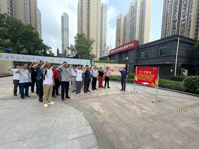 在习近平总书记曾看望慰问社区居民的小广场上,全体党员开展了重温入党誓词活动,大家佩戴党员徽章,举起右拳,面向鲜艳的党旗,在党委书记林更茂同志带领下齐声重温入党誓词,在心中更加坚定了入党的初心,更加坚定了共产党员的信仰。