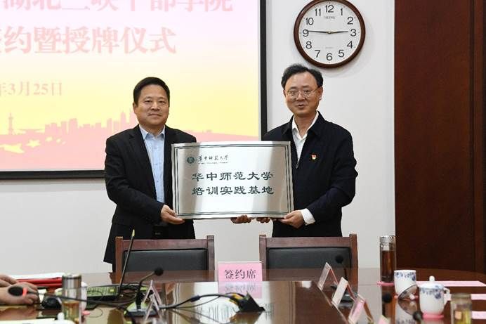 3月25日下午,双方在湖北三峡干部学院举行培训基地签约暨授牌仪式。湖北三峡干部学院常务副院长邹青松,副院长周道成、杨成珍、何迪,我校培训中心党委书记林更茂、副主任李娜出席仪式。