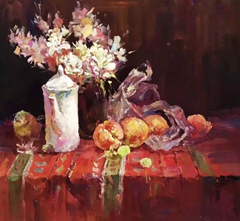 常莉老师的作品《宁静》,水粉画,静物写生。图画色彩绚丽、线条分明、流畅,常老师通过细致的物品勾画,展示出了一幅宁静、愉悦、祥和的图景。