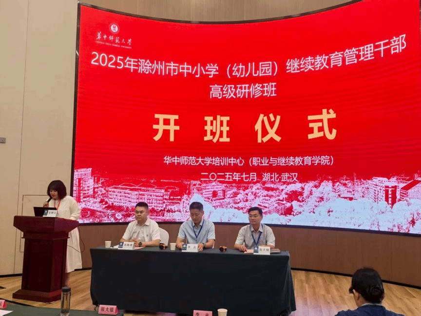 (通讯员:陶彦 王婧 张敏)2025年7月22日上午,“滁州市中小学(幼儿园)继续教育管理干部高级研修班”开班典礼在华中师范大学顺利举行。滁州开放大学党委书记张大银、滁州市教育体育局副局长李志、华中师范大学培训中心副主任吴海涛出席典礼并致辞。来自滁州市各县(市、区)教育体育局继续教育分管负责人、教师进修学校校长及县级开放大学校长共55位学员参加培训。
