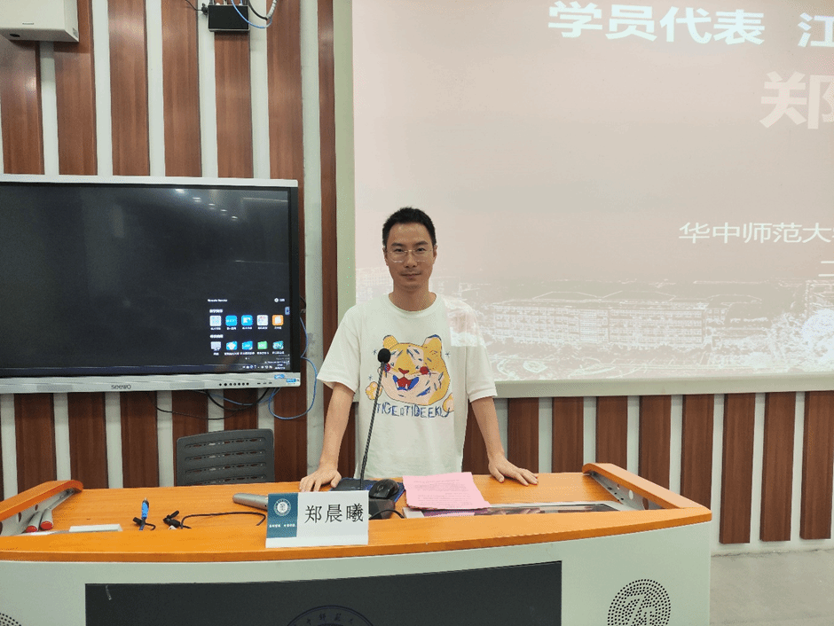 江夏区五里界小学的郑晨曦老师作为学员代表发言。他代表全体学员郑重承诺:潜心研习,精思笃行;开放交流,互促共进;返岗即践,知行合一。全体参训教师将以此培训为新起点,做勤奋的学习者,做积极的交流者,做踏实的践行者,不断提升专业素养,服务乡村音乐教育。