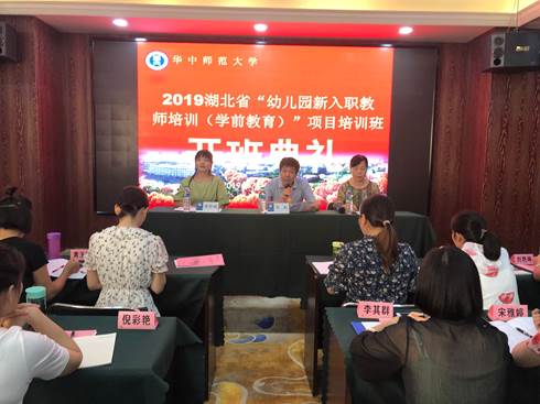 2019年7月27日上午,国培计划(2019)湖北省“幼儿园新入职教师培训(学前教育)”项目(B007)正式在武汉开班。炎炎夏日,来自湖北省荆州市、天门市、神农架等99位新入职的幼儿教师聚集一堂,参加由华中师范大学承办的此次培训,开班典礼现场气氛浓厚而热烈。开班典礼由班主任胡晓红老师主持,华中师范大学培训中心副主任(职业与继续教育学院副院长)朱虹和教师培训部杜芳主任、王静副主任等领导莅临会场。