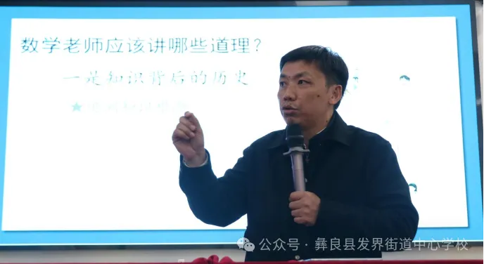 接着,教育发展研究院危雄院长就《有逻辑的教学——数学老师也要讲道理》向老师们做了交流探讨。他告诉老师们,数学老师不仅要讲知识,也要讲道理。就如何善于讲道理,危院长告诉老师们要从编者的视角、从古人的视角、从学生的视角来完成“讲道理”的阐释。