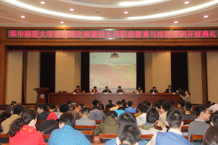 3月28日上午,首届湖北省退役士兵职业教育与技能培训班开班典礼在我校科学会堂报告厅顺利召开。华中师范大学副书记黄晓玫、湖北省军区动员处主任余廷胜、湖北省人力资源与社会保障厅职业鉴定中心副主任叶旭辉、武昌区民政局局长孔屏、华中师范大学职业与继续教育学院书记陈传忠等出席,职教院副院长吴绍靖主持了典礼。