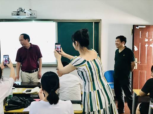 随后,卢子洲院长一行又走进湖北省“国培计划(2019)”非师范类新教师教学技能提升培训(初中物理) 项目培训教室,跟学员们同样进行了友好互动。学员们纷纷围拢来交流,谈感想,话课改,叙未来。交谈中,卢子洲院长了解到,有3位国培学员来自他的母校广水一中,于是兴趣盎然地邀请大家一起合影留念。