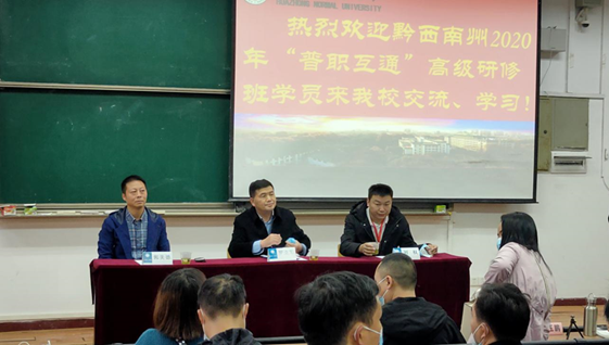 郭美德副院长代表学校致欢迎辞,表示我们要认真学习和贯彻习近平总书记关于办好人民满意的教育精神,育人模式要多元创新,不断完善自我修养,不断提升专业技能水平。他指出,优秀的教育需要优秀的老师,华师历史悠久,文化深厚,欢迎黔西南州2020年“普职互通”高级研修班的老师们的到来。同时,今年是疫情防控的非常时期,希望老师们学习之余要严格遵守学校的疫情管控措施。