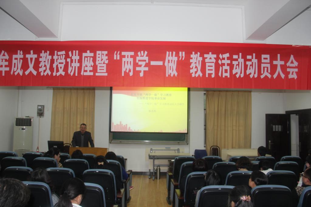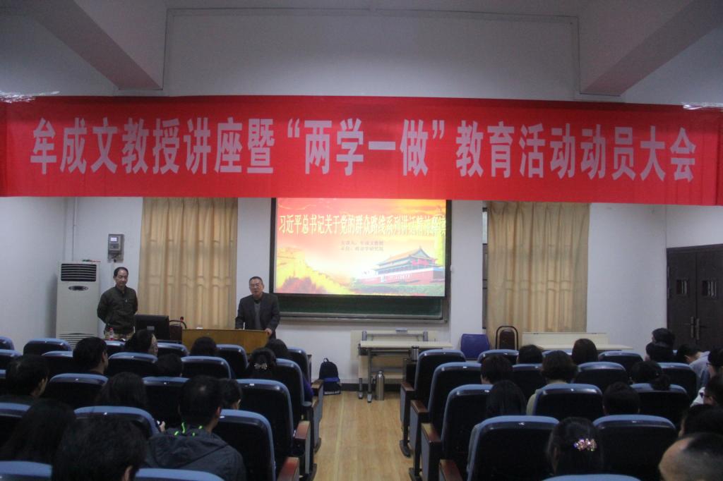 职业与继续教育学院4月26日下午在南湖104报告厅召开全体教职工大会,学院党委书记廖水明做“两学一做”学习教育活动动员报告。政治学研究院教授牟成文为全体教职工做《习近平总书记关于党的群众路线系列讲话精神释读》专题辅导报告。