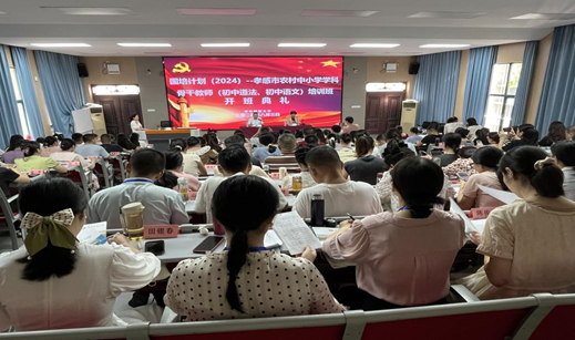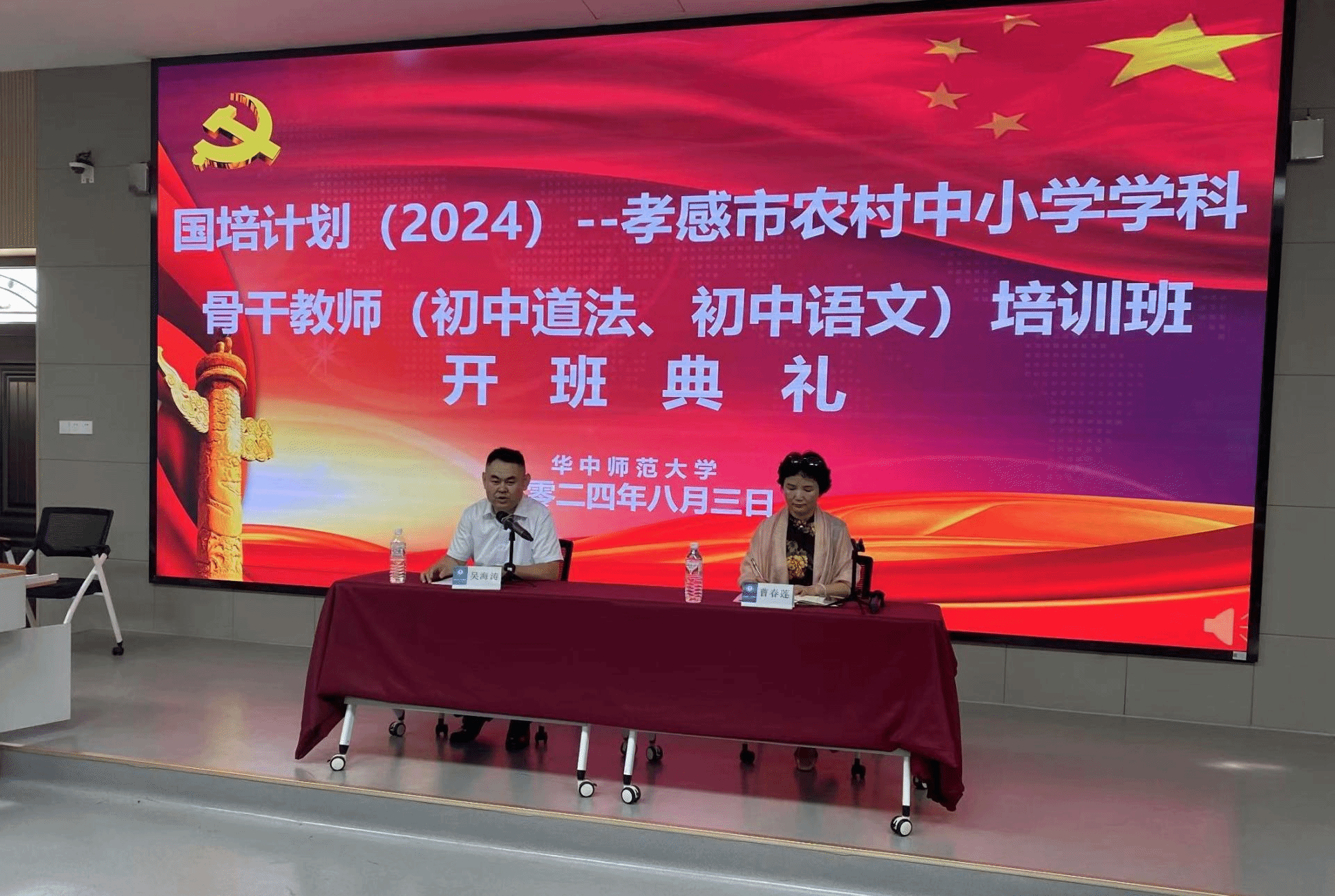 (通讯员:康芳、余鑫)2024年8月3日,“国培计划(2024)”——孝感市农村中小学学科骨干教师(初中道法、初中语文)培训班开班仪式在华中师范大学七号教学楼举行。华中师范大学培训中心副主任吴海涛、孝感市教育科学研究院工会主席曹春莲出席仪式并发言,华中师范大学培训中心班主任刘红、朱爱华、彭咏梅、李卉老师,及110位参训学员共同参加。开班典礼由班主任彭咏梅老师主持。本次培训旨在全面提升孝感市初中道法和初中语文学科骨干教师的专业素养与教学能力,进一步推动教师队伍整体素质的提升,为新时代教育事业的蓬勃发展注入强劲动力。