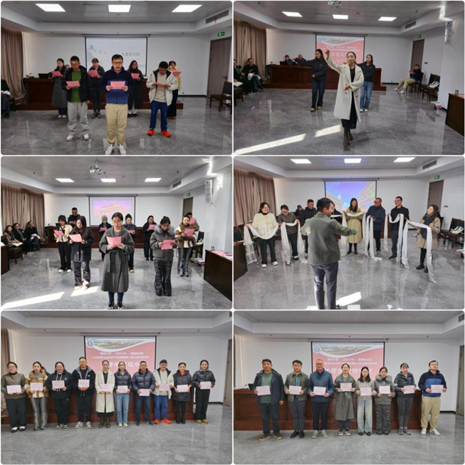 “守正创新铸师魂,道德法治育新人”。结业典礼上,班主任朱老师带领大家回顾了过去十五天的培训历程,并鼓励学员们继续前行。随后文艺汇演将典礼推向高潮,学员们根据道德与法治学科特色,结合本次培训所见所感,将爱国主义教育、红色文化融入到文艺汇演的节目中,展示了道德与法治教师们赤诚的爱国之心与高尚的育人之德。还有学员为大家带来民族舞蹈,将西藏自治区的精彩风貌展现给大家。精彩的表演不仅赢得了阵阵掌声,更展现了学员们多才多艺的一面。最后,班主任朱老师为全体学员颁发结业证书,老师们一齐举着证书合影留念,留下了欢快的笑容。