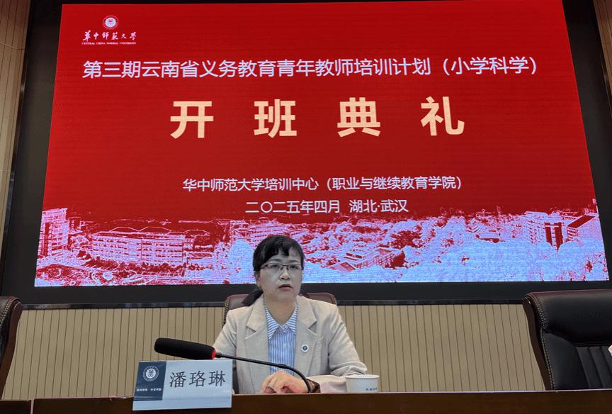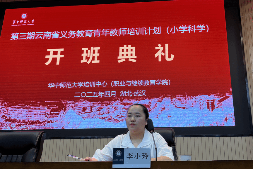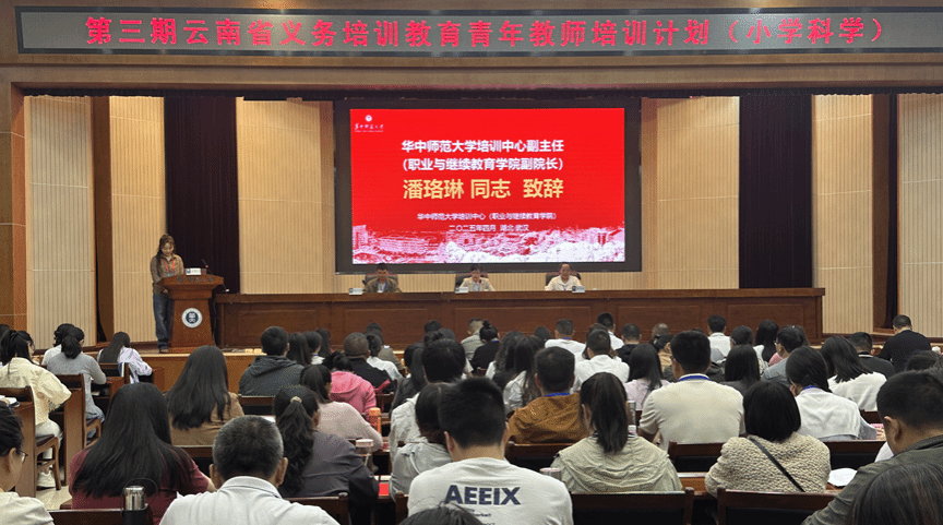 (通讯员:付浩会 刘红 朱爱华 刘娟)2025年4月9日上午,第三期云南省义务教育青年教师培训计划小学科学培训班开班典礼在华中师范大学科学会堂一楼报告厅隆重举行。华中师范大学培训中心副主任潘珞琳出席典礼并致辞,开班典礼由班主任揭丽老师主持,来自云南省各地的200名小学科学青年骨干教师齐聚一堂,开启为期42天的集中培训,共同探索“以学为主”的小学科学课堂教学改革新路径。