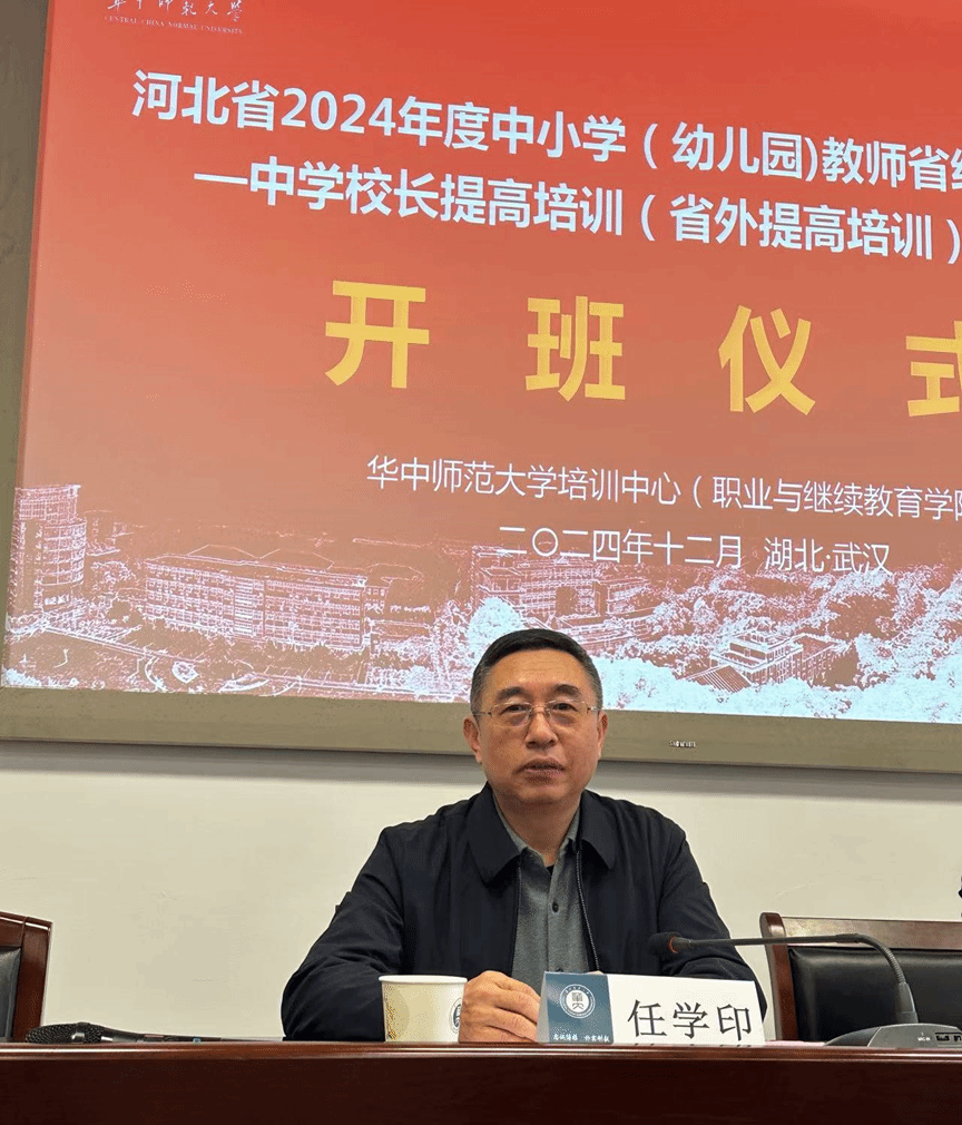 2024年12 月 19 日上午,河北省2024年度中小学(幼儿园)教师省级培训项目中学校长提高培训(省外提高培训)第3期开班典礼在华中师范大学举行。华中师范大学培训中心专职组织员汪昌海、河北省省委教育工委党校(河北省教育干部学院)校长任学印、河北省省委教育工委党校(河北省教育干部学院)培训部主任李向军出席开班典礼,培训班62名校长参加了此次开班典礼。