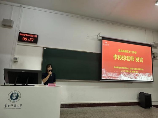 宜昌高新区土门中学李传琼老师代表全体学员发言。她感谢“国培计划”为宜昌农村地理教师搭建宝贵的学习交流平台,并倡议全体学员珍惜机会、严守纪律,圆满完成各项研修任务。